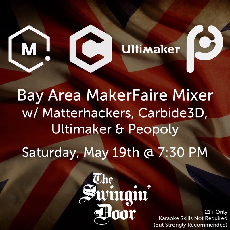 Come meet us at the Swinging Door at 7:30 - 9:00 on Saturday, May 19th. We'll be there, buying drinks, with Matter Hackers, Ultimaker, and Peopoly. (It is a bar so it's age 21 and up)