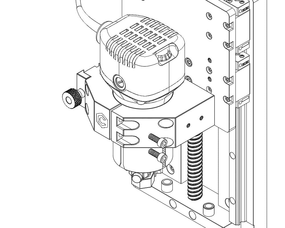 - Using a 5mm hex key, loosen the two M6x20 bolts on the spindle mount's right side.
