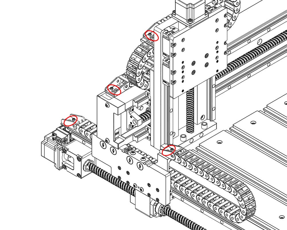 - Using a 2.5mm hex key, remove the eight M3x6 socket head screws that secure the left-side Y-axis and rear-most X-axis drag chain. The bolts are located on the left Y carrier plate, left Y rail/limit switch mount, left X extrusion, and rear X/Z drag chain bracket.
