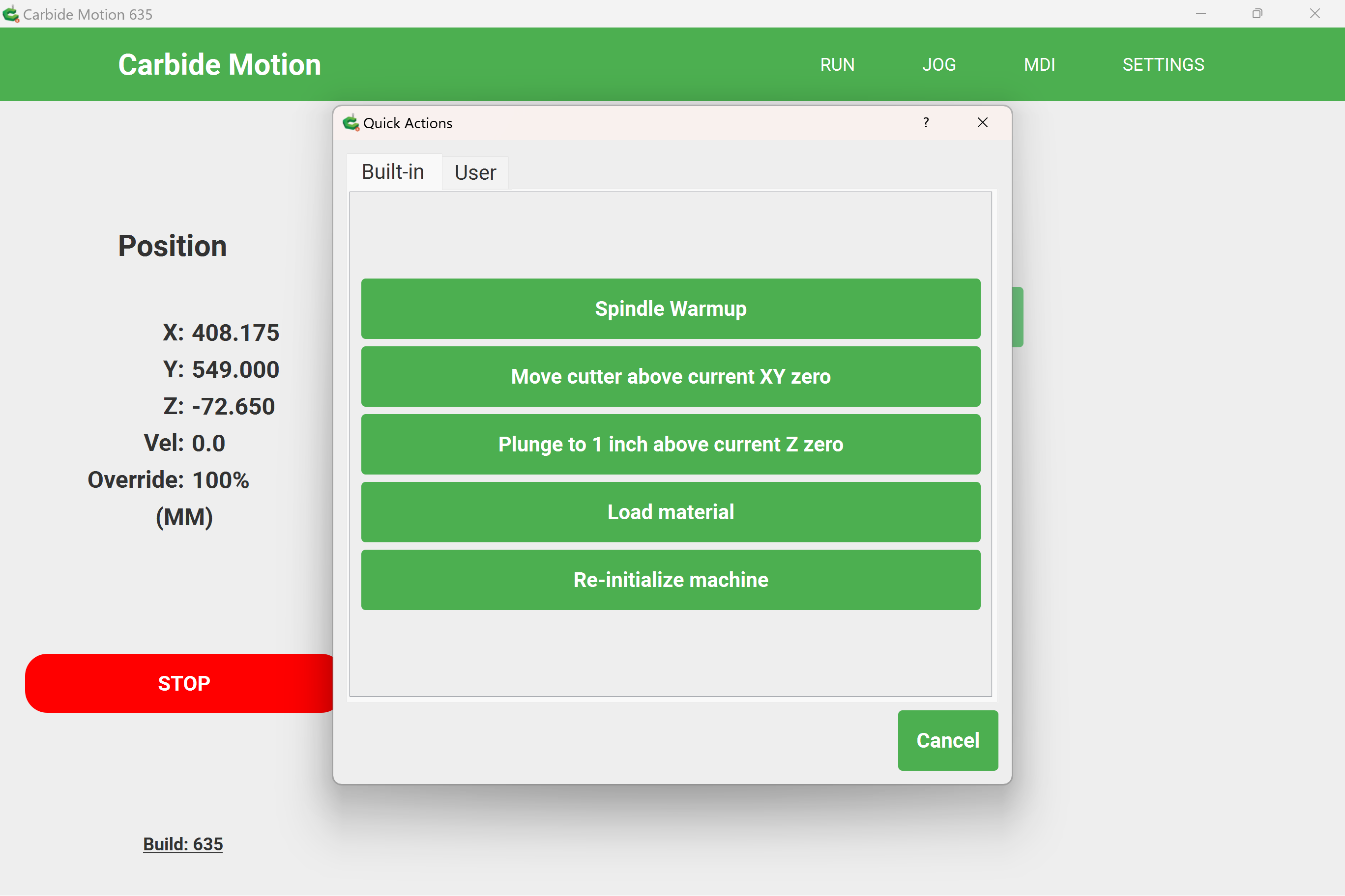 - You can run a built-in warm-up cycle through Carbide Motion's Quick Actions menu.