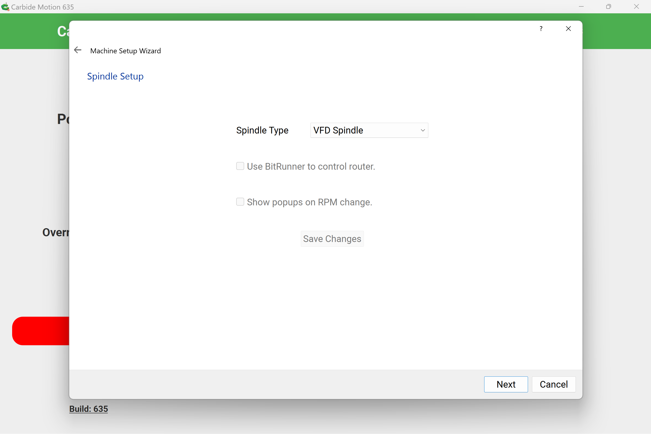 - When prompted for the type of spindle being used on your CNC, select VFD Spindle