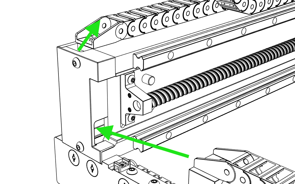 - Ensure the threaded spindle connector is on the side of the drag chain that terminates on the Z-axis.