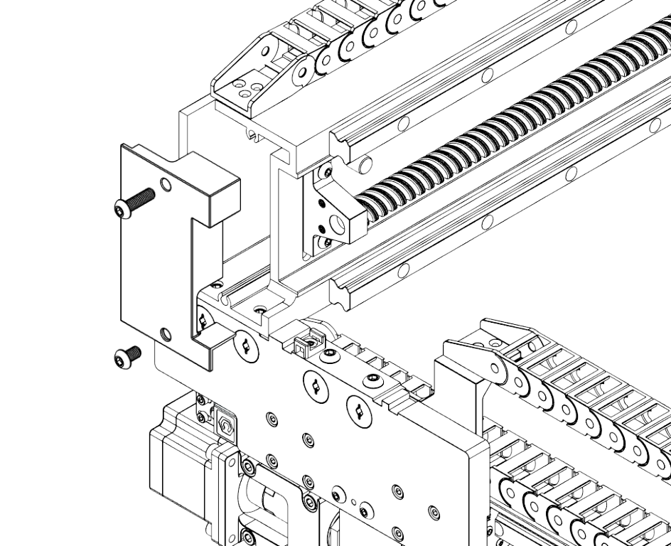 - Using a 2.5mm hex key, remove the eight M3x6 socket head screws that secure the left-side Y-axis and rear-most X-axis drag chain. The bolts are located on the left Y carrier plate, left Y rail/limit switch mount, left X extrusion, and rear X/Z drag chain bracket.