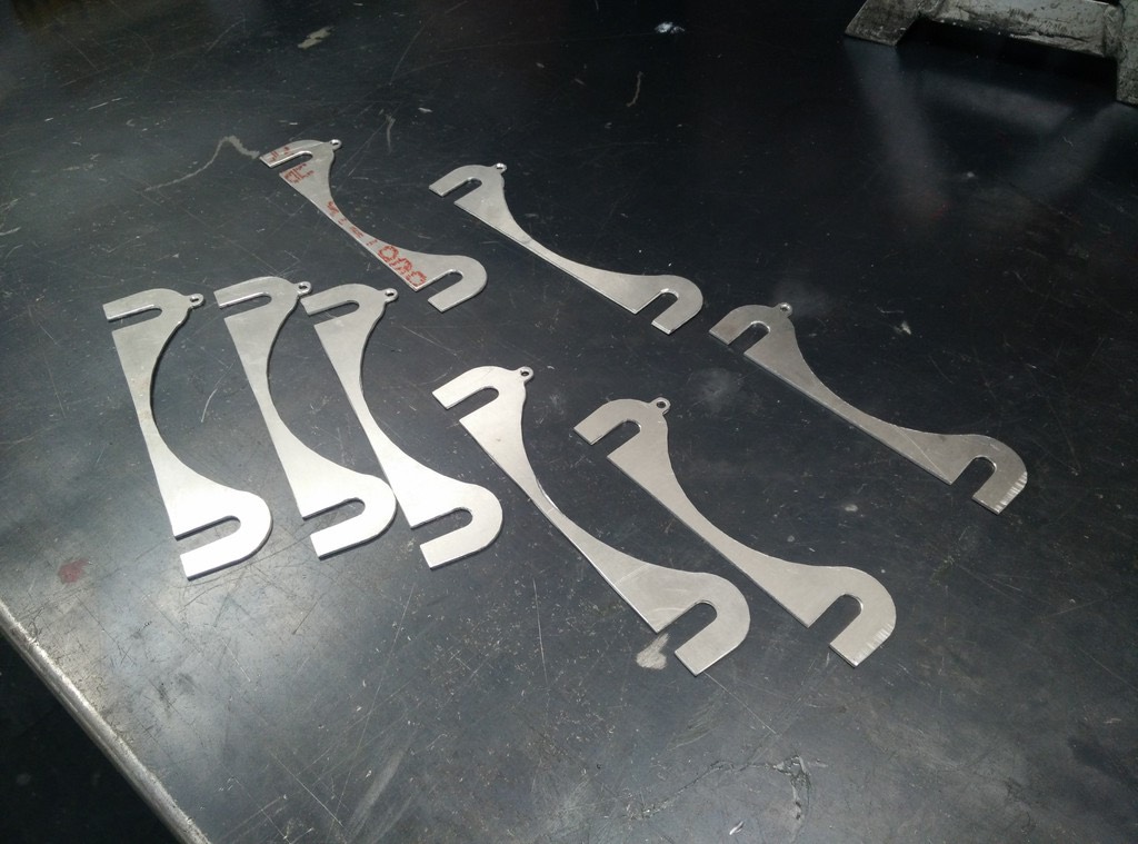 The parts are called camber shims and are used to adjust the camber on the front and rear of a P1 prototype running in SCCA. The car is a French made Norma featuring a carbon fiber chassis and a Honda engine. The car is pictured without the bodywork.